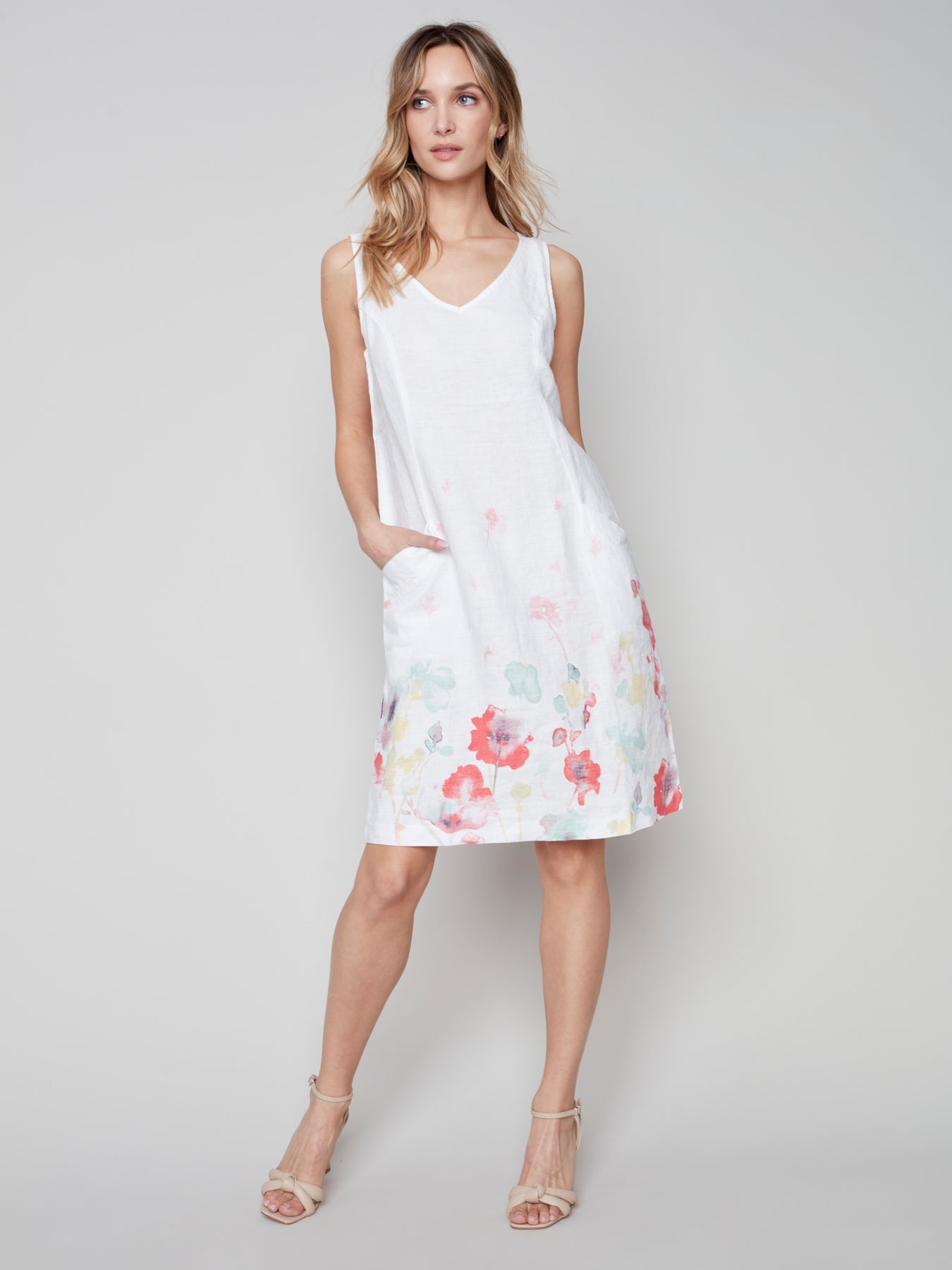 Feel like you frolic in a field of flowers when you wear this sleeveless women’s dress featuring a vibrant flower-inspired Grapefruit print, a flattering V neck and two front diagonal pockets. Dress it up or down easily and wear it again and again. We’d do the same!